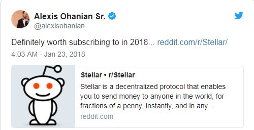 Reddit上的加密貨幣專區一直為網民及用戶的集中地,其創始人的取態亦舉足輕重。首席執行官及創始人之一Alexis昨日(2018年1月23日)於其推特上道,”Stellar於2018年絕對值得關注…”